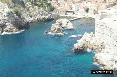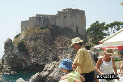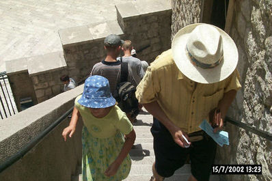 Blo je 35 v senci in trije turisti na pol kvadratna metra. Čez eno uro smo že švicali v avtobusu (da bi parkirali v središču mesta so bile le pobožne želje, da bi se vozili s kolesom - preveč hribovito). Ne dolgo za tem pa smo ponovno - ne, švicali je preblaga beseda za tisto kar se je dogajalo na obzidju Dubrovnika. Norcem, ki v taki vročini plezajo po obzidju seveda še zaračunajo. Že takoj na začetku sva z malko premišljevala o skoku dveh obupancev čez ograjo v prijetno morje.