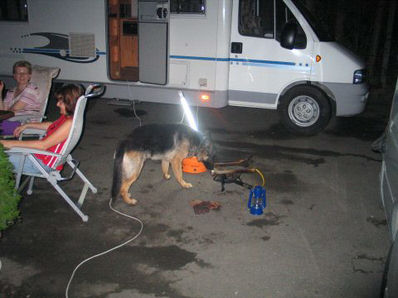 Žal smo prispeli tako pozno, da so bili vsi samostani že zaprti in je bilo zato policaju takoj jasno kam pes taco moli. Plava luč in "no parking" .... in drugič smo pristali v kampu.